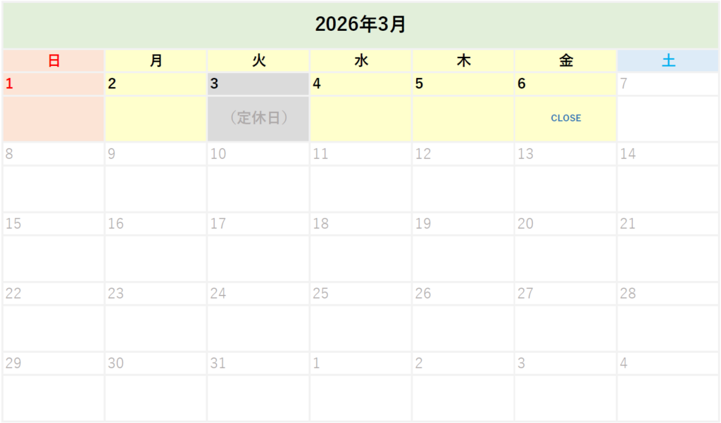 - 毎週火曜日は定休日です。(祝日および年末年始は除く)